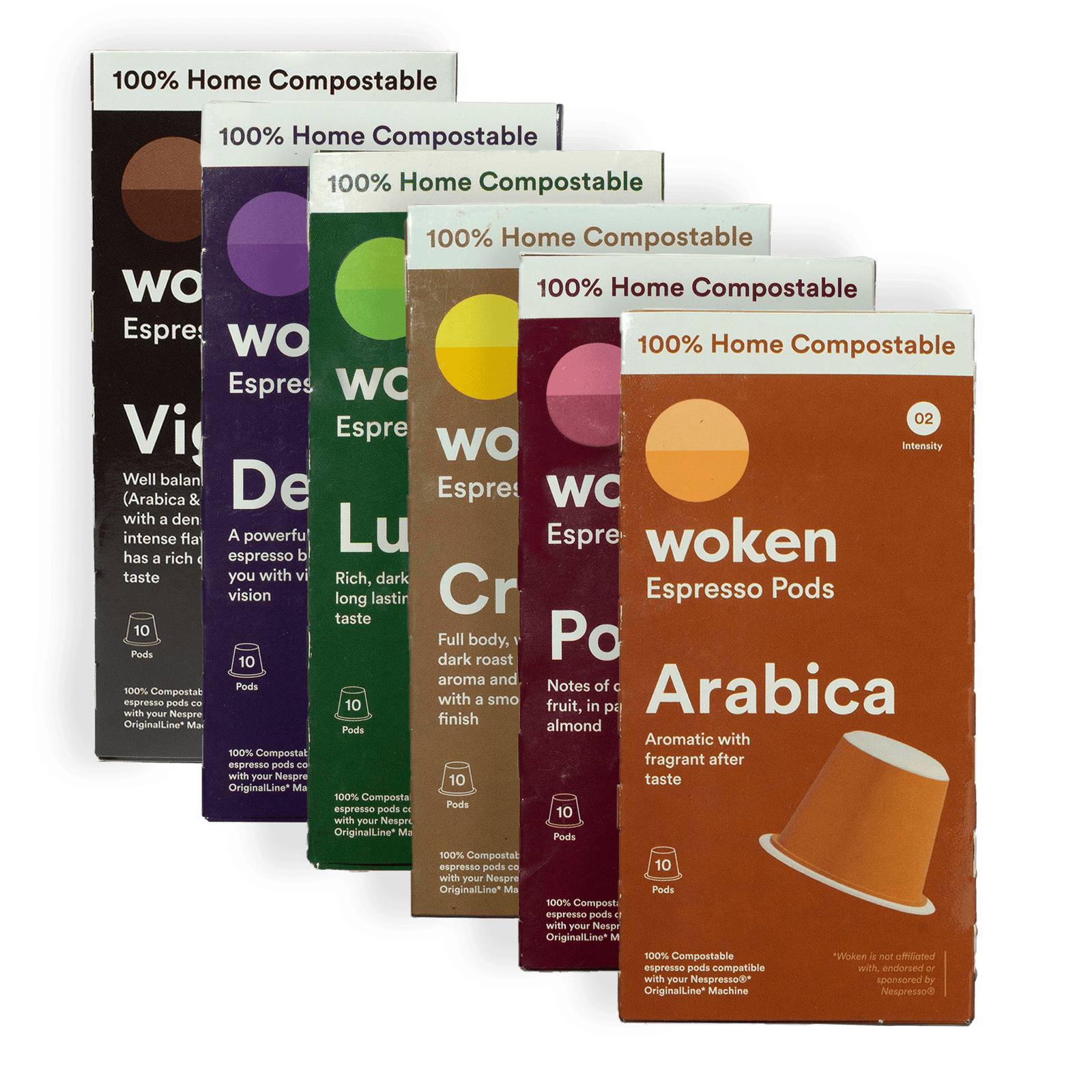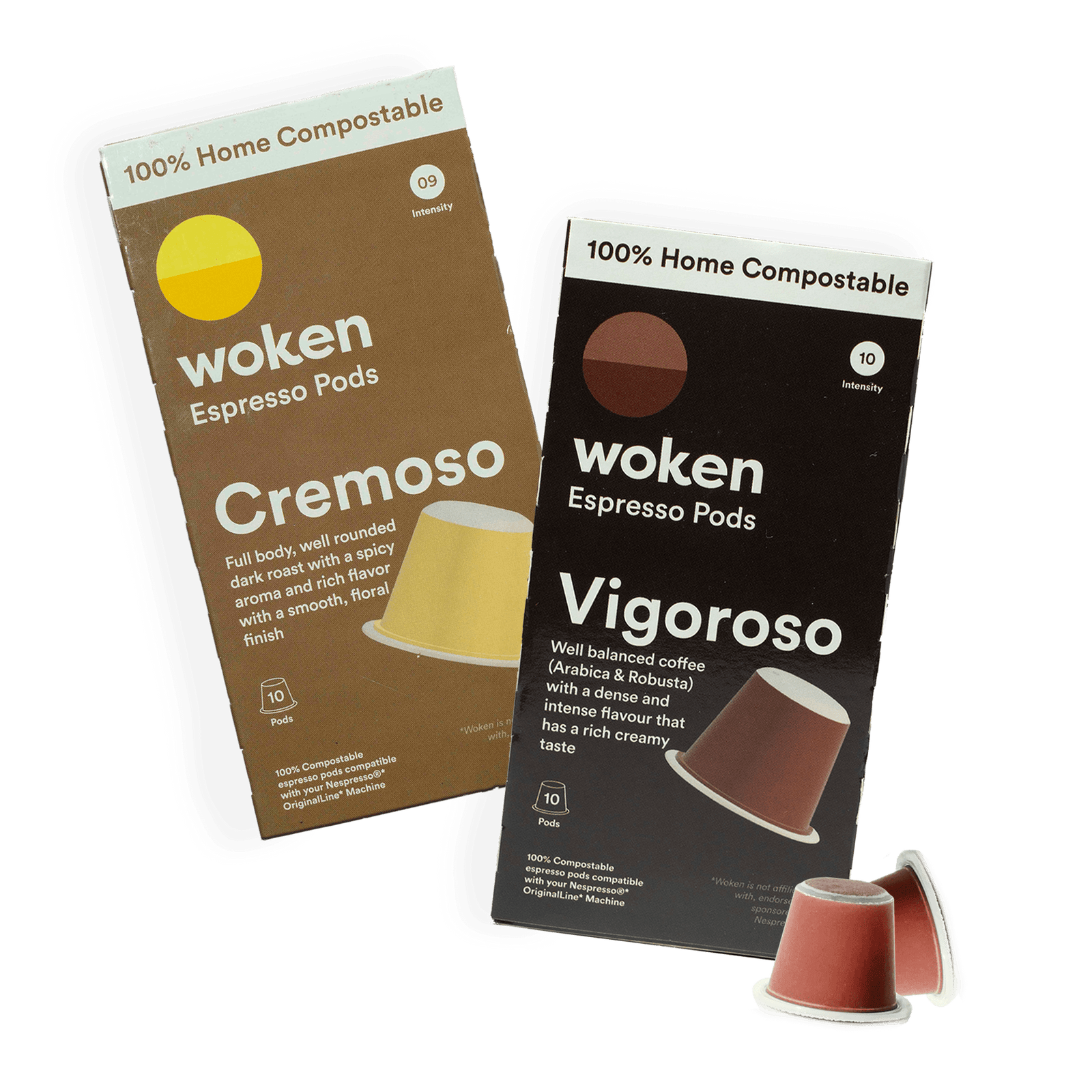 Woken’s pods are 100% compostable, compatible with home espresso machines and the environment. They are filled with wonderful blends varying in intensity, from South America to India and easy to make, drink, and dispose of. Our Arabic and Robusta beans are roasted and ground lovingly in Italy and sold digitally throughout the continental United States of America. Match your mood to our espresso, drink up, then break it all down.